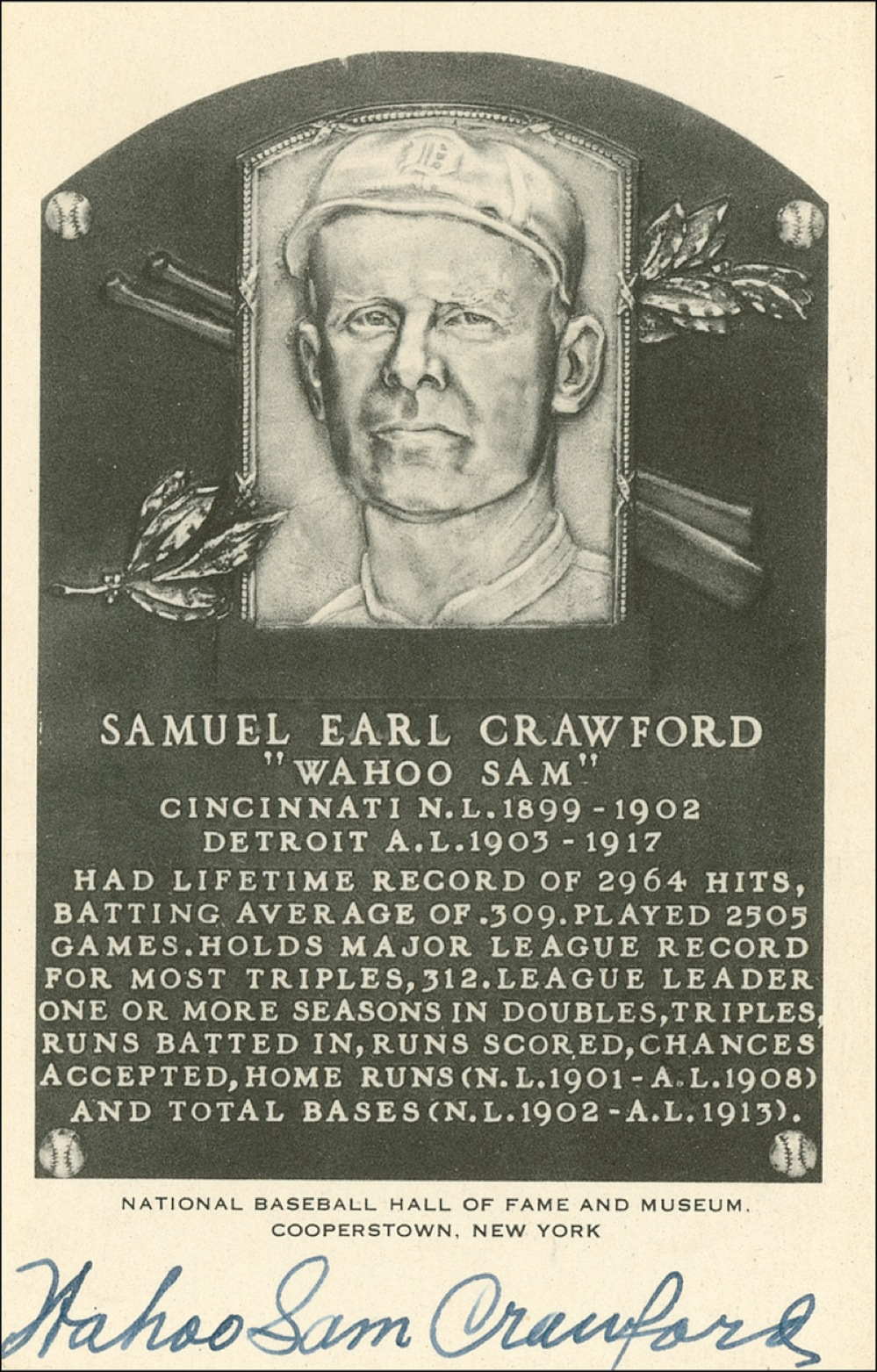 Baseball Hall of Famer who still maintains the major league record for the most inside-the-park home runs in a season with 12 in 1901, and the most in a career with 51. Black and white Hall of Fame plaque card, signed along the bottom in fountain pen “Wahoo Sam Crawford.” In very fine condition. JSA/Mike Gutierrez Auction LOA and RRAuction COA.