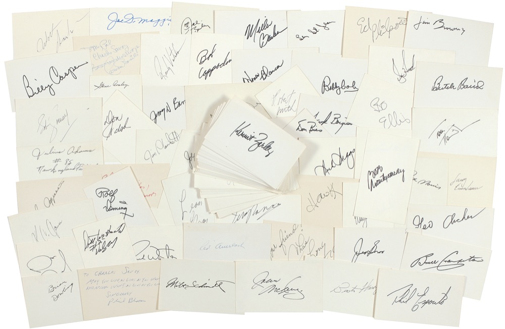 More than 125 ink and felt tip signatures on individual white and off-white 5 x 3 cards. Included: Julius Adams, Red Auerbach, Ace Bailey, Butch Baird, Miller Barber, Carmen Basilio, Joe Bellino, Homer Blanca, Phil Bloom, Johnny Bucyk, Don Budge, Gino Cappelletti, Wayne Cashman, Billy Casper, Wilt Chamberlain, Gerry Cheevers, Jimmy Clark, Gene Conley, Chuck Connor, Bob Cousy, Bruce Crampton, Joe DiMaggio, Brian Downing, Dick Drago, Larry Eisenhauer, Bo Ellis, Ron Erhardt, Phil Esposito, Chris Evert, Doug Ford, Pancho Gonzalez, Leon Gray, Dick Hanscom, Buster Harvey, Bunky Henry, Lionel Herbert, George Johnson, Tom Johnson, Ed Johnston, Jones K. C. Jones, Jean King, Bill Lesuk, Denny Lyons, Frank Malzone, Don Marcotte, Richard Martinez, Jerry McGee, Ed McHugh, Peter McNabb, Bobby Mitchell, Bob Montgomery, Riley Morris, Bob Murphy, Bob Nevin, Bobby Orr, Brad Park, Bob Payne, Jim Plunkett, Dean Prentice, Mike Reasor, Milt Schmidt, Harry Sinden, Dallas Smith, M. Smith, Len St. Jean, Fred Stanfield, Charlie Summer, Ron Sussey, Rocky Thompson, Lee Trevino, Ken Venturi, Charley Volpone, Don Walsh, Eddie Westfall, Don Whitt, Tom Williams, Terry Winter, and Kermit Zarley. In fine condition overall, with scattered light handling wear. RRAuction COA.