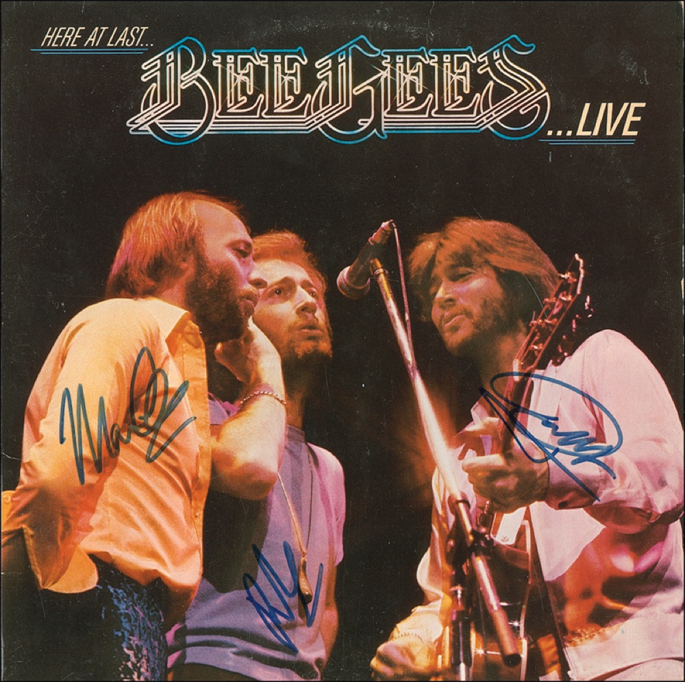 Here At Last ... Bee Gees ... Live album, signed in blue felt tip on the front cover by Barry, Robin, and Maurice Gibb. In fine condition, with light ring wear. The record is not included. JSA/Roger Epperson (REAL) Auction LOA and RRAuction COA.