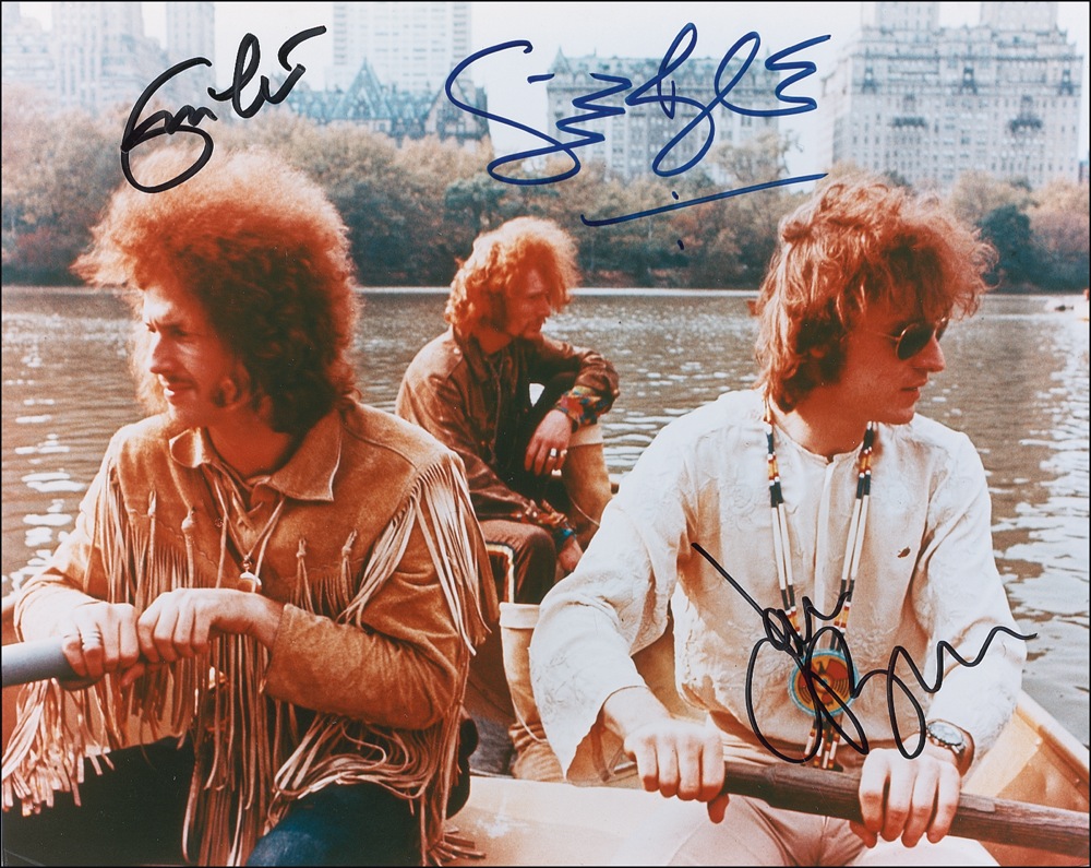 Color glossy 8 x 10 photo of the band in a rowboat, signed in black felt tip by Eric Clapton and Jack Bruce and in blue felt tip by Ginger Baker. In fine condition. JSA/Roger Epperson (REAL) Auction LOA and RRAuction COA.