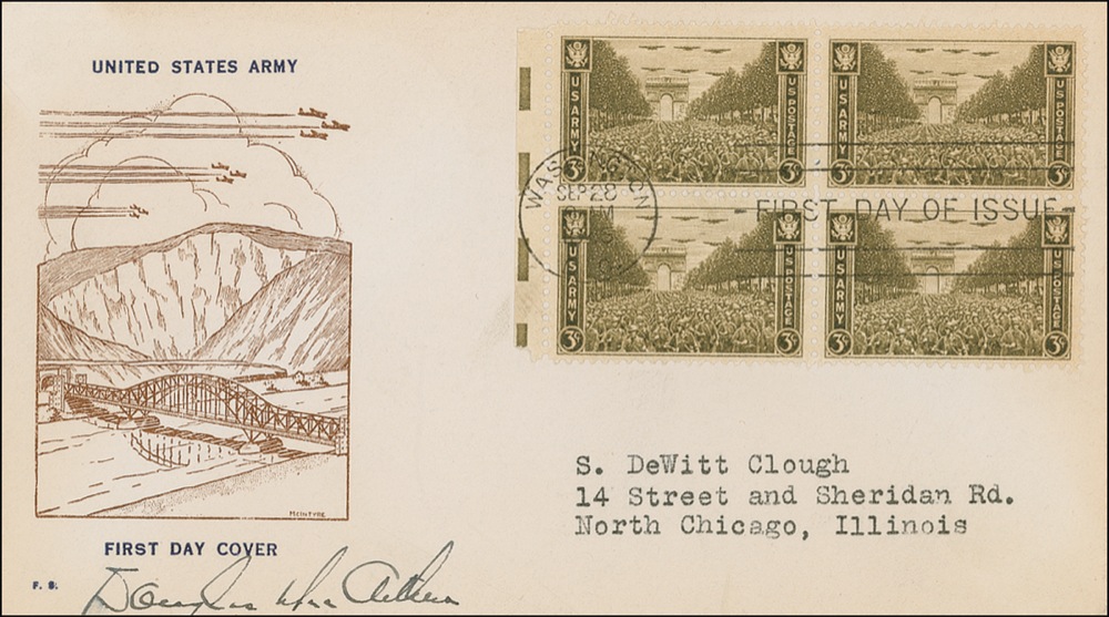 FDC, 6.5 x 3.5, 1945, with a cachet honoring the United States Army, signed in ink. Faint brush to first letter, and mild handling wear, otherwise fine condition. RRAuction COA.