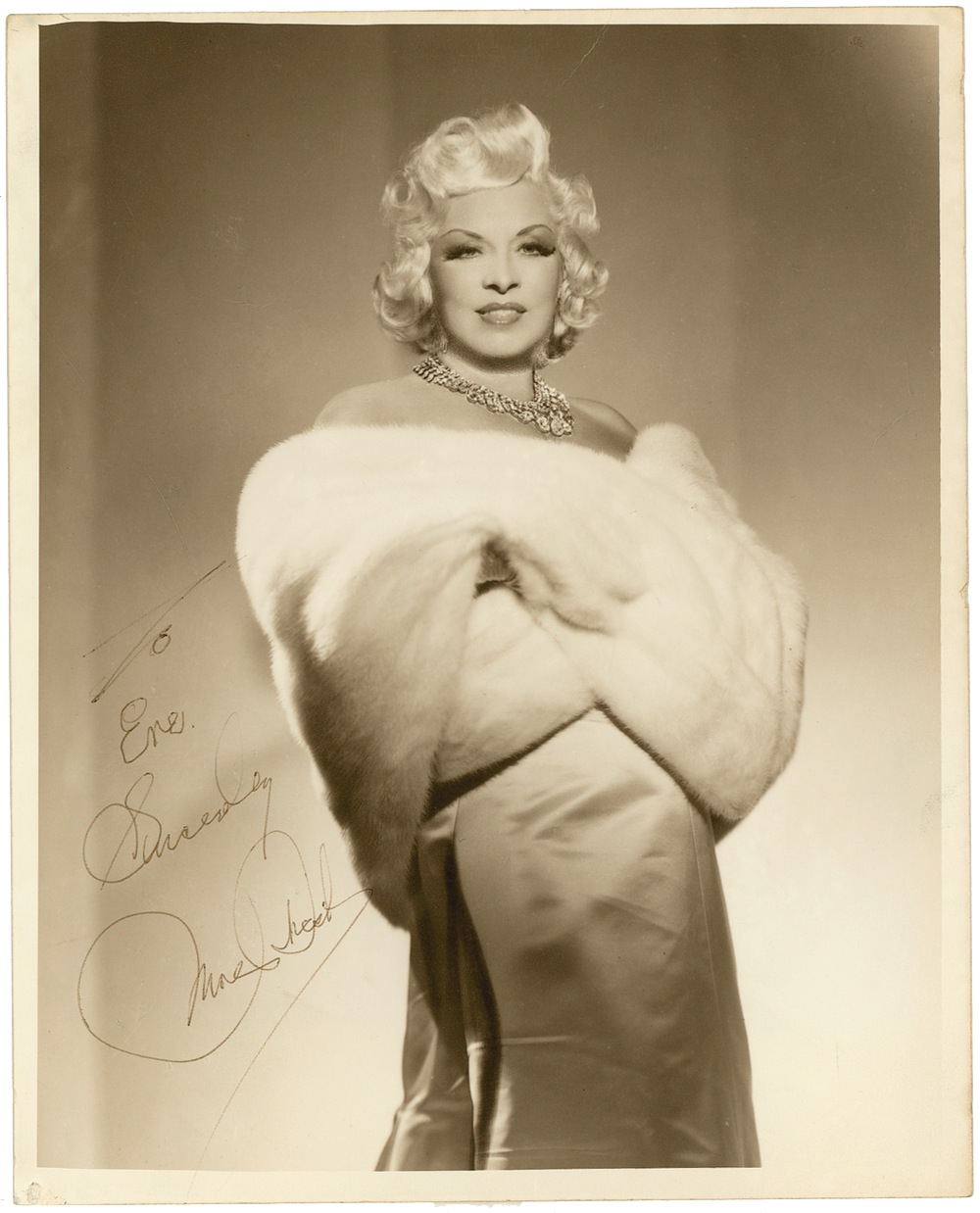 Vintage matte-finish 8 x 10 photo, signed and inscribed in black ink “To Eve, Sincerely, Mae West.” Scattered light surface marks and creases, otherwise fine condition. RRAuction COA.