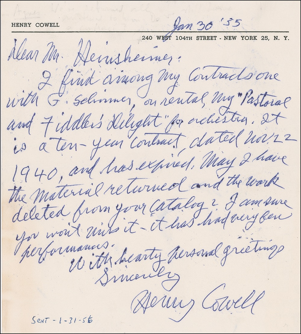 Pioneering American composer (1897–1963) best known for his experimental, avant-garde works employing a wide range of innovative sonic resources, including new ways of playing the piano. ALS, one page, 6.25 x 7, personal letterehead, January 30, 1955. Cowell writes to Mr. Heinsheimer. In part: “I find among my contracts one with G. Schirmer, on rental, my ‘Pastoral and Fiddler’s Delight’ for orchestra. It is a ten-year contract, dated Nov. 22, 1940, and has expired. May I have the material returned and the work deleted from your catalog? I am sure you won’t miss it—it has had very few performances….” Small secretarial ink notation and a hint of mild soiling and handling wear, otherwise fine condition. RRAuction COA.