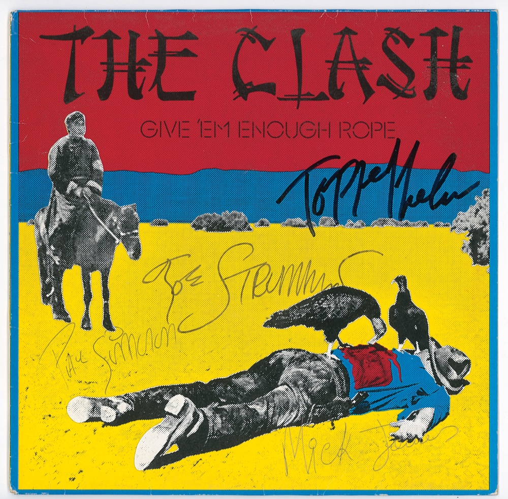 Give ‘Em Enough Rope album signed on the front in felt tip and ballpoint by Joe Strummer, Paul Simonon, Mick Jones, and Topper Headon. In fine condition, with some scattered light edge and corner creasing. The record is not included. Pre-certified Roger Epperson/REAL and RRAuction COA.