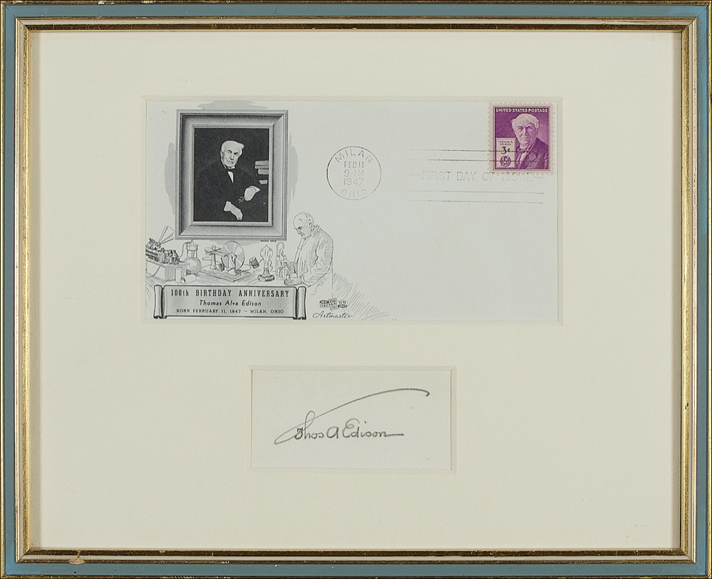 Bold pencil “umbrella” signature, “Thos A. Edison,” on an off-white card. Matted and framed with an unsigned FDC honoring Edison’s 100th birthday to an overall size of 10.75 x 8.75. In fine condition. RRAuction COA.