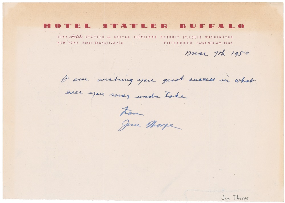 Versatile Native American athlete (1887–1953), widely regarded as the finest all-around athlete of the twentieth century, who won two Olympic gold medals and excelled in football, baseball, and basketball. His Olympic medals were stripped from him for an ostensible violation of the amateur status rule (Thorpe had earlier played minor-league baseball) but were posthumously restored to him in 1983. Vintage ink signature and sentiment, “I am wishing you great success in what ever you may under take, From Jim Thorpe,” on an off-white 8.5 x 6 sheet of Hotel Statler Buffalo stationery, dated March 7, 1950. In fine condition, with two vertical folds, trimmed bottom edge, and a mild strip of toning along top edge. JSA/Mike Gutierrez Auction LOA and RRAuction COA.
