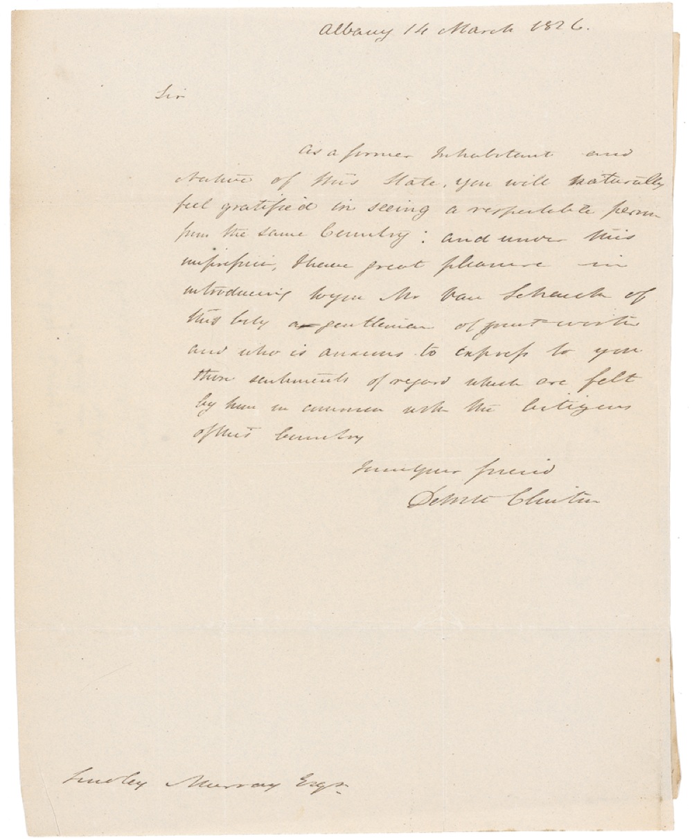 ALS, one page, 8 x 10, March 16, 1826. Clinton writes noted grammarian and Quaker minister Lindly Murray, introducing Mr. Van Schaick “who is anxious to express to you those sentiments of regard which are felt by him in common with the citizens of this country.” Intersecting folds, and scattered creases, otherwise fine condition. RRAuction COA.