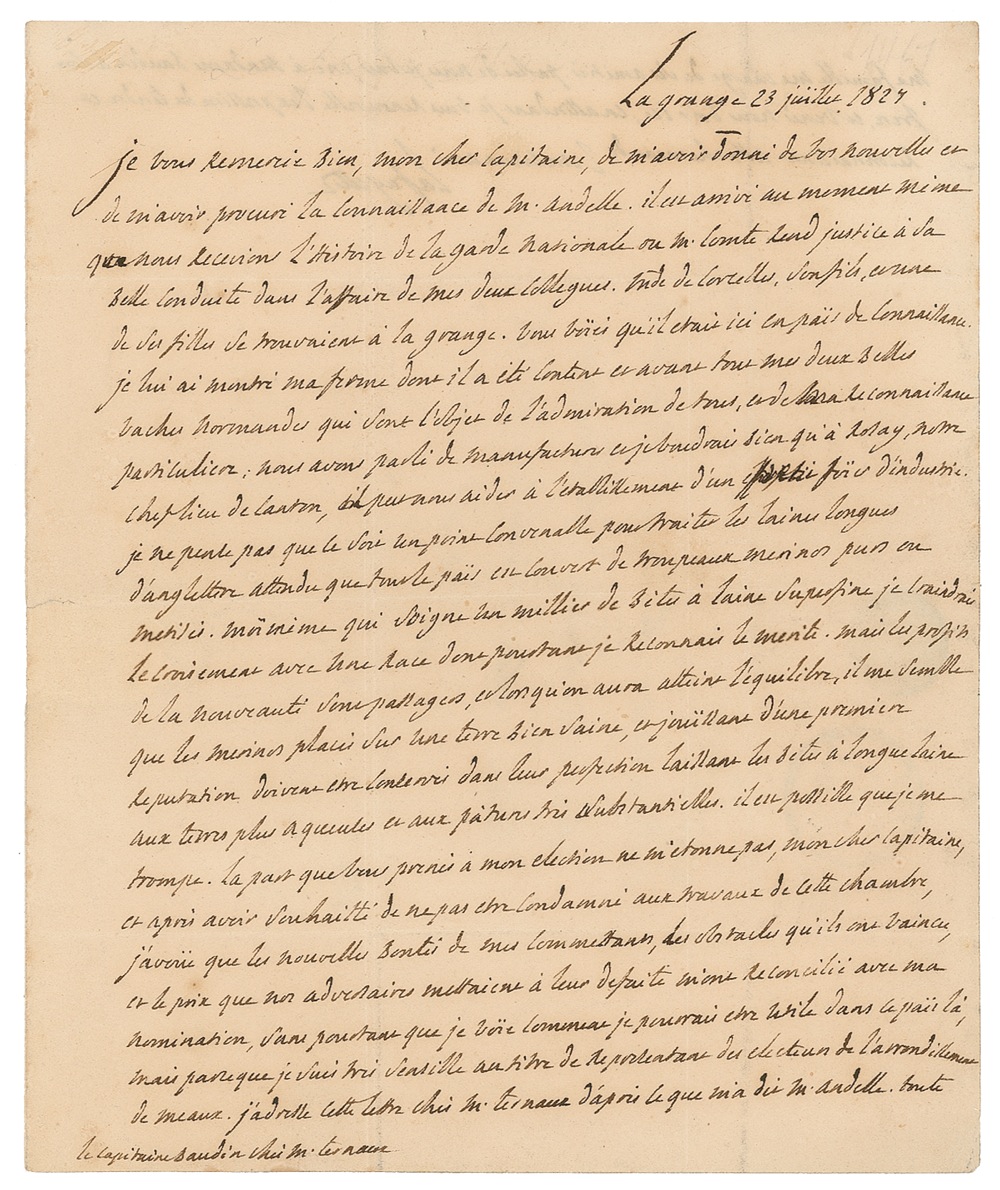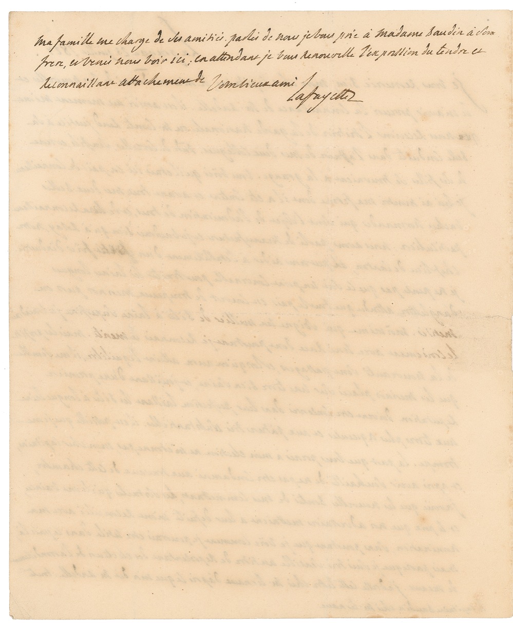 ALS in French, signed “Lafayette,” one page both sides, 7.25 x 9, dated July 23, 1824. In this thoroughly well-kept missive, American Revolutionary War hero Marquis de Lafayette (1757-1834) comments on his newest political post following the close of the historic battle, and remarks too as to his obligation to embrace this most recent position. Mailed to military colleague M. le Capt. Baudin, the letter reads in part: “Thank you very much for having given me your news and introducing Mr. Andell to me. He arrived at the very moment we received the History of the National Guard in which M. Comte renders justice to his fine behavior in the affair of my colleagues … I showed him my farm … he praised my two Normandy cows which are the object of everyone’s admiration … The role you played in my election [to the Chamber of Deputies] does not surprise me … After having wished not to be condemned to the work of the chamber, I must confess that the renewed efforts of my supports, the obstacles they overcame and the price that our enemies had to pay for their defeat have reconciled me to my nomination. And yet, I do now see how I could be of service in that District.” The famous revolutionary signs simply, “Lafayette,” and though a light intersecting fold passes through a single letter of the signature (the first “e”), the writing carries strong display properties. Paper loss affects the second page, and a shade of mild toning is also present; otherwise fine condition. Evidently, Lafayette believed the recipient of this note to be instrumental in ensuring his election to the Chamber of Deputies, in which Lafayette served from 1818 to 1824. Just eleven days before writing this letter, President Monroe invited the Frenchman to visit the United States, and upon his arrival, the American ally found that Congress voted him a grant of $200,000 to go with a township of 24,000 acres—all in consideration of his services during the Revolutionary War. RRAuction COA.