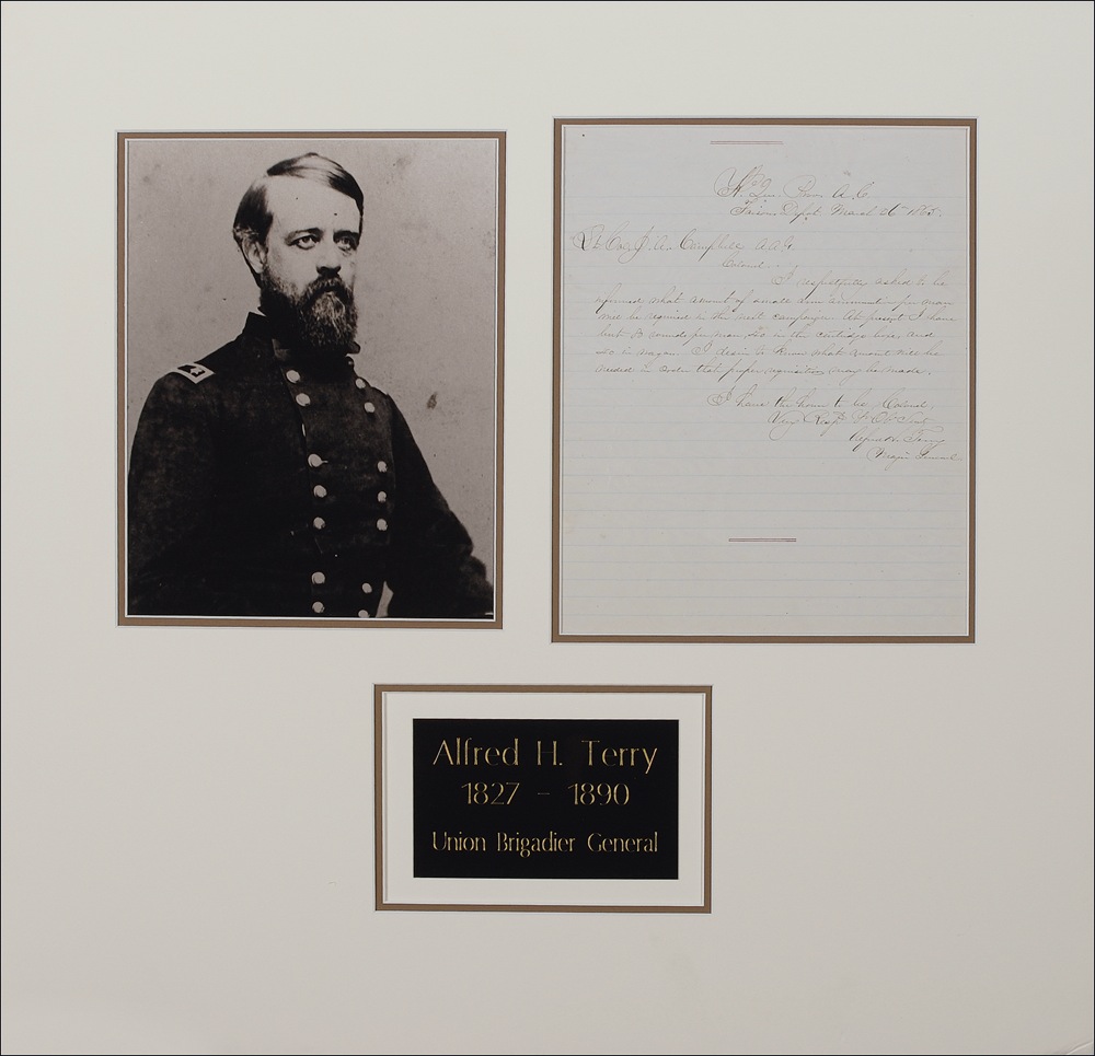 Union general (1827–1890) who fought at First Bull Run and Port Royale, and who, after the war, became commander of the expedition against the Sioux during which Custer met his end at Little Bighorn. Uncommon war-dated ALS signed “Alfred H. Terry, Major General,” one lightly lined 7.75 x 9.5 page, March 26, 1865. Terry writes to Lt. Colonel J. A. Campbell. In part: “I respectfully asked to be informed what amount of small arm ammunition per man will be required in the next campaign. At present I have but 80 rounds per man, 40 in the cartridge boxes, and 40 in the wagon....” Double matted with a portrait of Terry in uniform and a small plaque to an overall size of 21 x 20. In fine condition. RRAuction COA.