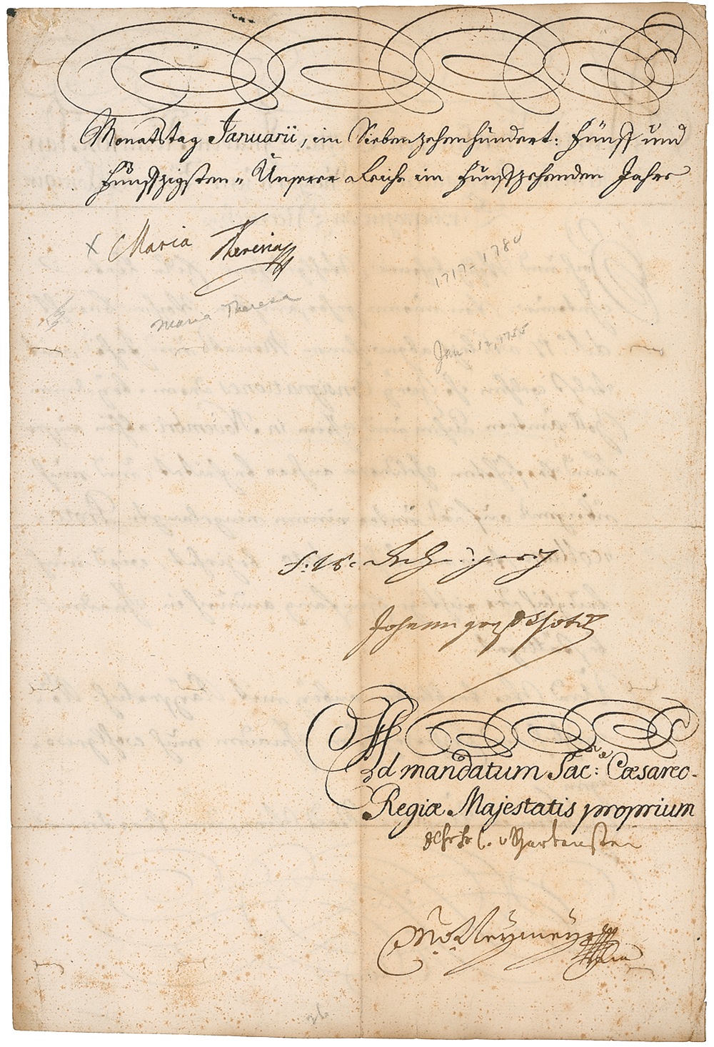 Empress of Austria (1717–1780) and mother of Marie Antoinette. Manuscript DS in German, signed “Maria,” one page both sides, 9 x 13.5, January 12, 1755. A boldly penned untranslated document signed on the reverse. In very good condition, with intersecting storage folds (one through opening stroke of signature), mild toning and foxing (a bit heavier to front), and several pencil notations. RRAuction COA.