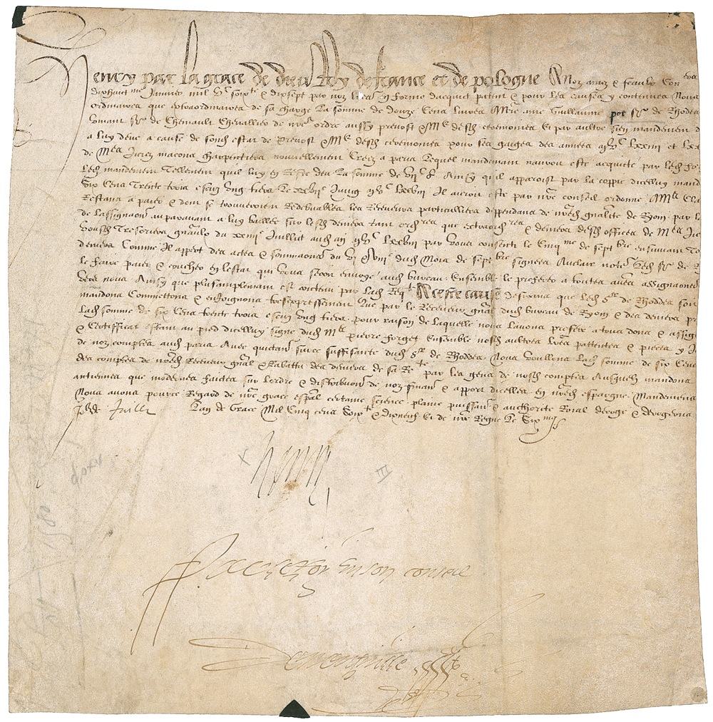 King of France (born 1551), the son of Henry II and Catherine de Medici, who reigned from 1574 until his assassination in 1589. DS in Old French, signed “Henri,” one page on vellum, 11 x 11.25, 1580. An untranslated official document. In very good condition, with previous storage folds, light toning and soiling (lightly affecting signature), mild wrinkles, and a few small pencil notations. RRAuction COA.