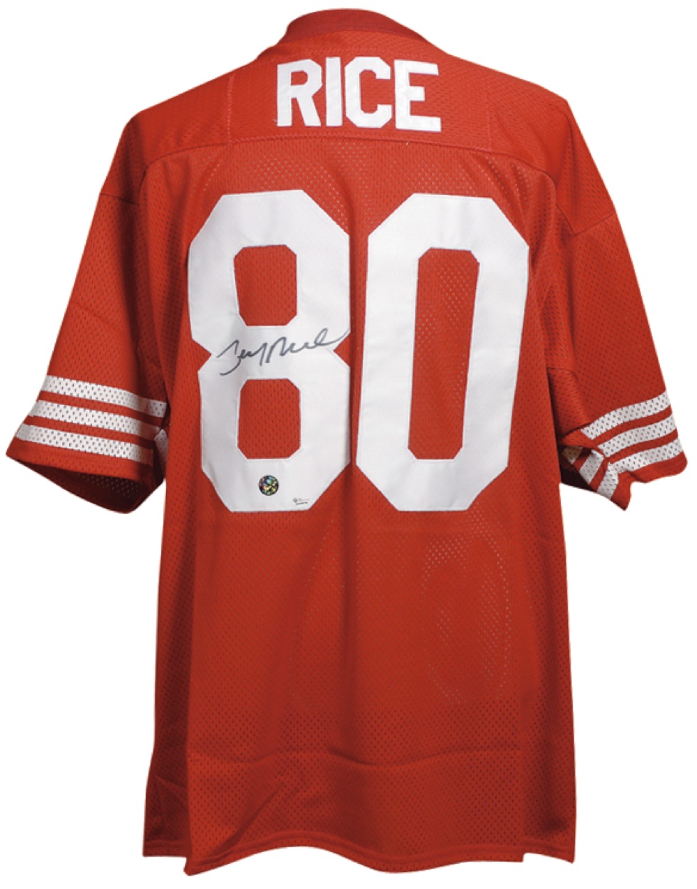 Official replica San Francisco 49ers home football jersey, with sewn on letters and numbers, signed in black felt tip on the number on the back. In very fine condition. Pre-certified Steve Grad/PSA/DNA and RRAuction COA.