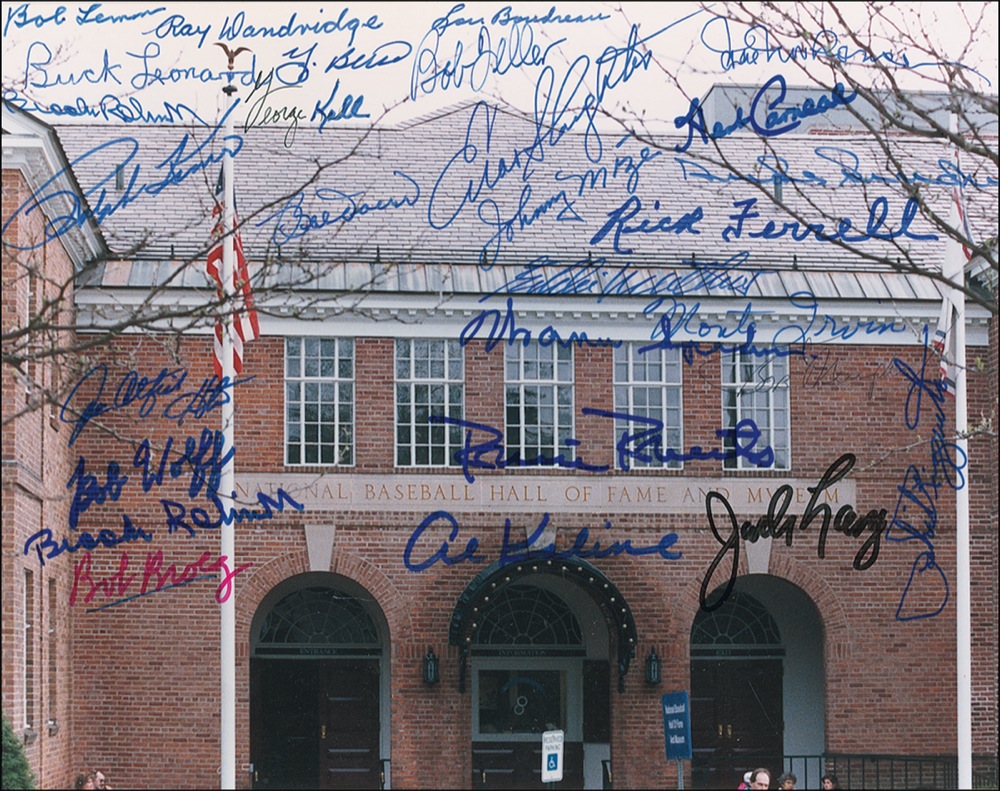 Color satin-finish 10 x 8 photo of the Hall of Fame in Cooperstown, signed in felt tip by twenty-seven inductees: Bob Lemon, Ray Dandridge, Lou Boudreau, Hal Newhouser, Buck Leonard, Yogi Berra, Bob Feller, Brooks Robinson (2), George Kell, Enos Slaughter, Herb Carneal, Ralph Kiner, Bobby Doerr, Johnny Mize, Duke Snider, Rick Ferrell, Eddie Mathews, Warren Spahn, Monte Irvin, Bob Murphy, Jim ‘Catfish’ Hunter, Bob Wolff, Robin Roberts, Bob Broeg, Al Kaline, Phil Rizzuto, and Jack Lang. Photo is affixed to an identical size piece of heavy cardstock. In fine condition. Pre-certified Steve Grad/PSA/DNA and RRAuction COA.