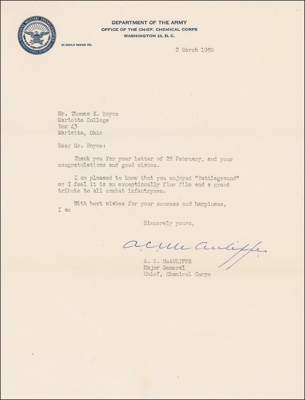 TLS signed “A. C. McAuliffe,” one page, 8 x 10.5, Department of the Army letterhead, March 2, 1950. McAuliffe sends thanks to a collector. In part: “I am pleased to know that you enjoyed ‘Battleground’ as I feel it is an exceptionally fine film and a grand tribute to all combat infantrymen.” Accompanied by the original mailing envelope. In fine condition. RRAuction COA.