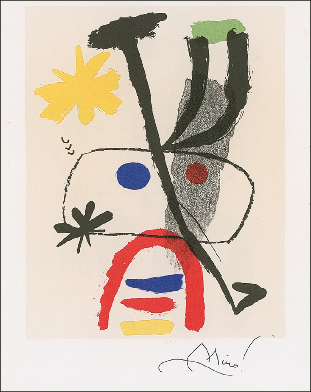 Color 8.5 x 10.75 book print of one of his works, signed in the lower border in black felt tip, “Miro!” In fine condition. RRAuction COA.