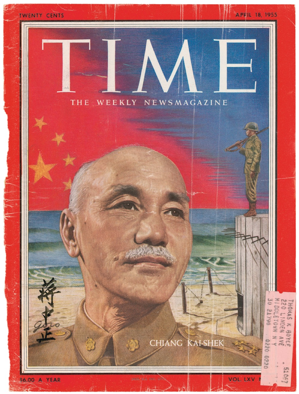 Chinese military officer and politician (1887–1975), one of the most durable leaders of the 20th century, who led the government of Republic of China from 1928 until his death. Magazine cover from the April 18, 1955, issue of Time, featuring the Chinese leader, boldly signed in Chinese in black ink in the lower left. Accompanied by a 1959 TLS from the Office of the President acknowledging the signature, as well as the original mailing envelope. Scattered creases and wrinkles, slight paper loss to left edge, and mailing label to lower right corner, otherwise fine condition. RRAuction COA.