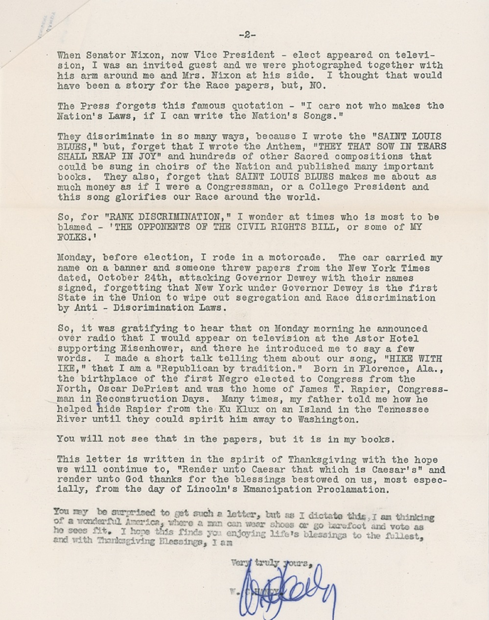 TLS, two pages, 8.5 x 11, Handy Brothers Music Co. Inc. letterhead, November 26, 1952. Lengthy and politically charged letter from Handy to an admirer. In part: “During the political campaign we published a song, ‘Hike With Ike,’ (Eisenhower and Nixon) which went all over the nation with five thousand letters stating why we published this song, and at my personal expense…I took part in many memorable programs…I thought the Race newspapers of Harlem would have made a news item of this…When Senator Nixon, now Vice President—elect appeared on television, I was an invited guest and we were photographed together…I thought that would have been a story for the race papers, but No. The Press forgets this famous quotation—’I care not who makes the Nation’s Laws, if I can write the Nation’s Songs.’ They discriminate in so many ways, because I wrote the ‘Saint Louis Blues,’ but, forget that I wrote the Anthem ‘They That Sow In Tears Shall Reap In Joy’ and hundreds of other sacred compositions that could be sung in choirs of the Nation…So, for ‘Rank Discrimination’ I wonder at times who is most to blame—’The Opponents of the Civil Rights Bill, or some of My Folks.” Accompanied by the original mailing envelope. In fine condition. RRAuction COA.