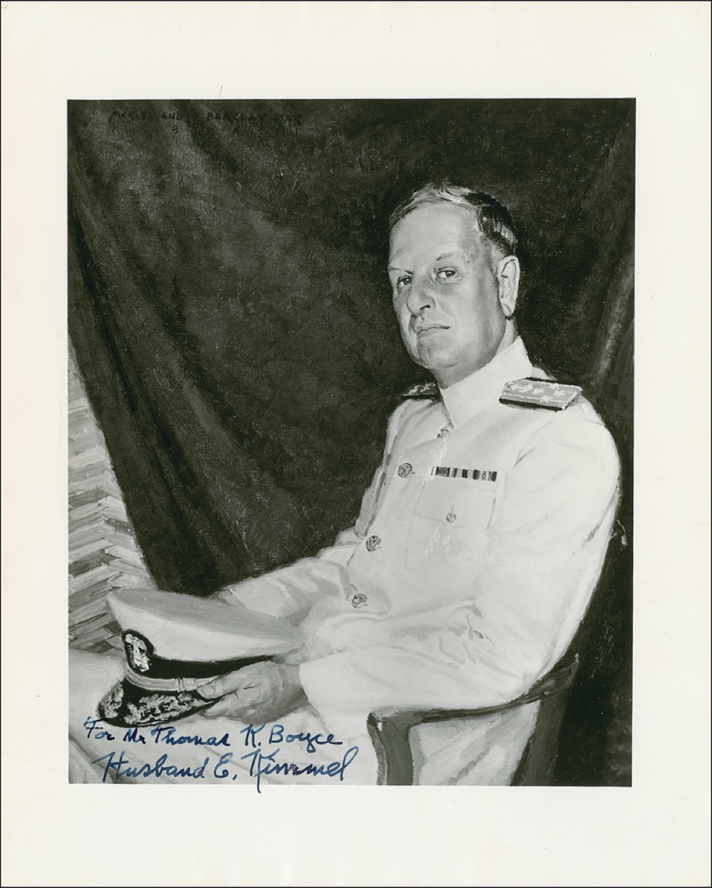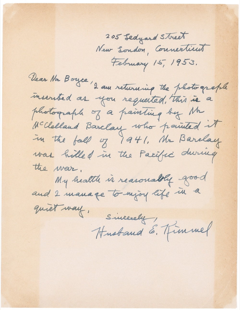 Two items: ALS, one page, 8.5 x 11, dated February 15, 1953. Kimmel responds to an autograph request. In part: “I am returning the photograph inscribed as you requested. This is a photograph of a painting by Mr. McClelland Barclay who painted it in the fall of 1941.”; and a vintage 8 x 10 photo of the Barclay portrait of Kimmel, signed and inscribed in fountain pen. In very good condition, with strips of toning to letter, rippling to edges of photo, and a few small edge tears. RRAuction COA.
