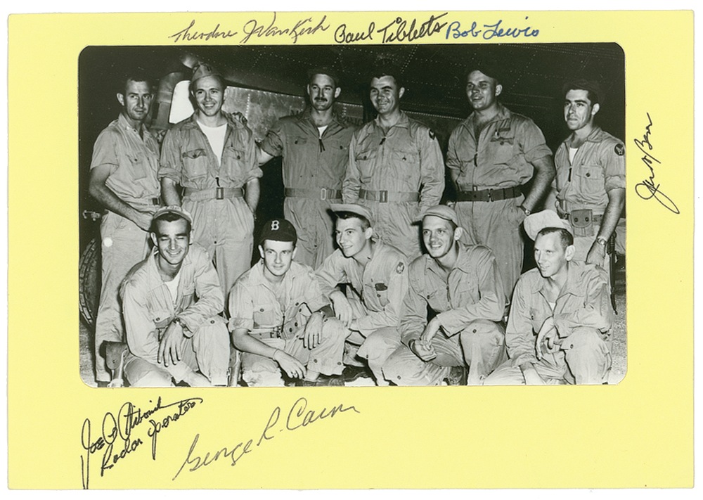 Satin-finish 5.5 x 3.5 photo of the Enola Gay crew, affixed to a 7 x 5 light yellow card, signed on the card in blue and black ink by Paul Tibbets, Bob Lewis, Theodore Van Kirk, George Caron, Joe S. Stibori, and Jacob Besser. In fine condition. RRAuction COA.