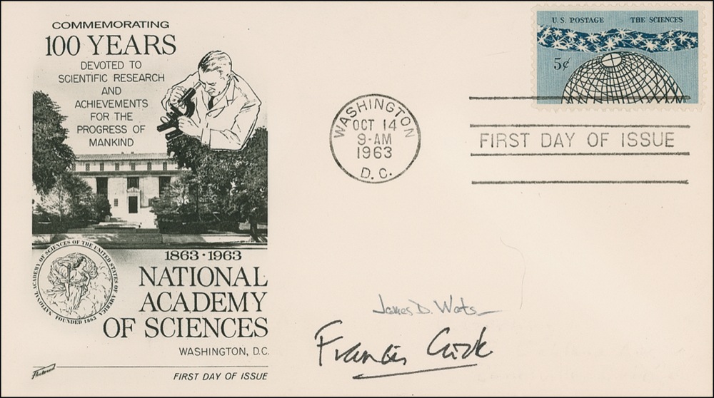 FDC with a cachet honoring the 100th anniversary of the National Academy of Sciences, signed in black ink by Francis Crick and black ballpoint by James Watson. In very fine condition. RRAuction COA.