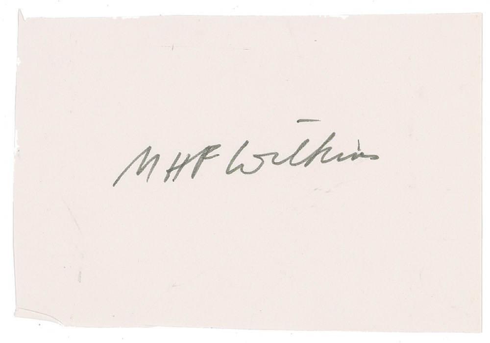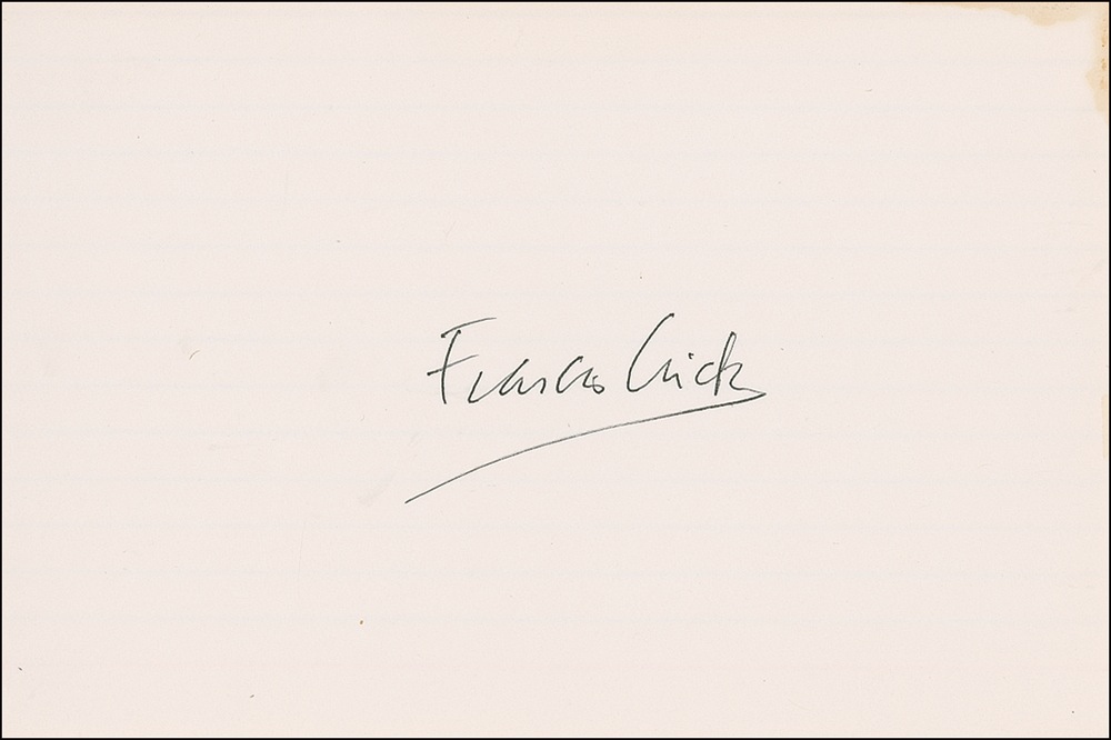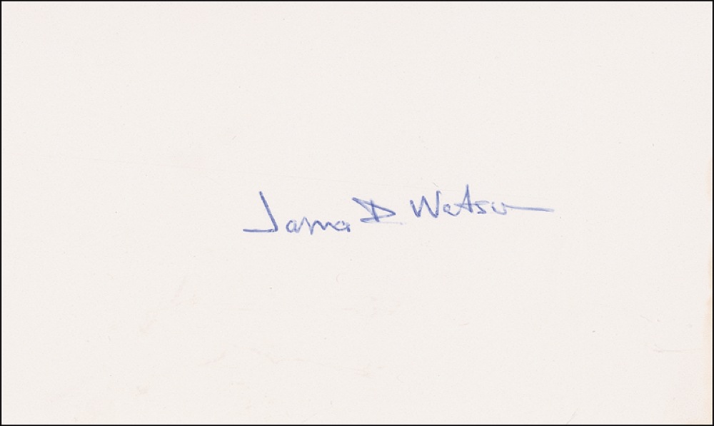 Along with Maurice Wilkins, James D. Watson (born 1928) and Francis Crick (1916–2004) shared the 1962 Nobel Prize in Medicine for discovering the function and structure of DNA, providing the prime impetus for further research in the emerging fields of molecular genetics and biochemistry. Ink signatures of Francis Crick, James D. Watson and M. H. F. Wilkins on individual off-white cards and slips. In fine condition, with a bit of slight toning to corner of one card. RRAuction COA.