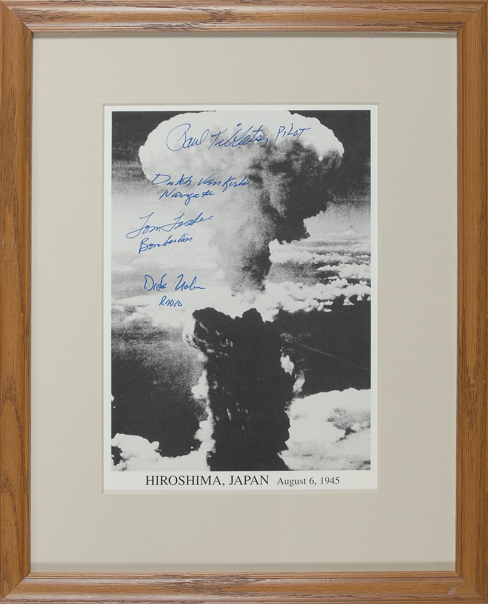 Chilling 6.75 x 9.5 photo of the Hiroshima mushroom cloud, signed in blue felt tip by Paul Tibbets, Dutch Van Kirk, Tom Ferebee, and Dick Nelson, with all four crew members adding their flight assignments. Matted and framed to an overall size of 12 x 15. In very fine condition. RRAuction COA.