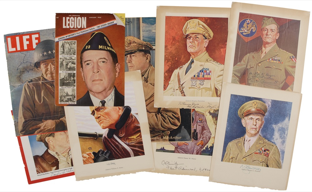 Nine items: five color prints, all 9.75 x 12.25, signed on the image or in the lower border in fountain pen by Douglas MacArthur (ins), Claire Chennault (ins), George C. Marshall, Chester W. Nimitz, and William F. Halsey; and four color magazine covers or photos, each signed in fountain pen by the respective officer pictured: three by Douglas MacArthur and one by Omar N. Bradley. In very good condition, with scattered toning to prints, and folds and wrinkles to magazine covers. RRAuction COA.