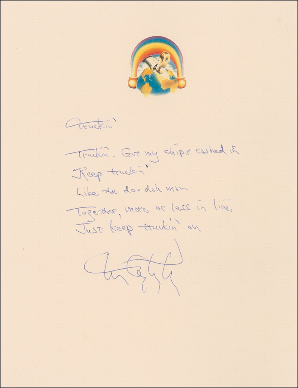 Handwritten lyrics to the opening verse of the Grateful Dead classic “Truckin,’” signed “Tom Constanten,” on an off-white 8.5 x 11 sheet of Dead-themed stationery. Constanten writes: “Truckin got my chips cashed in. Keep truckin, like the do-dah man; Together, more or less in line, just keep truckin’ on.” In very fine condition. RRAuction COA.