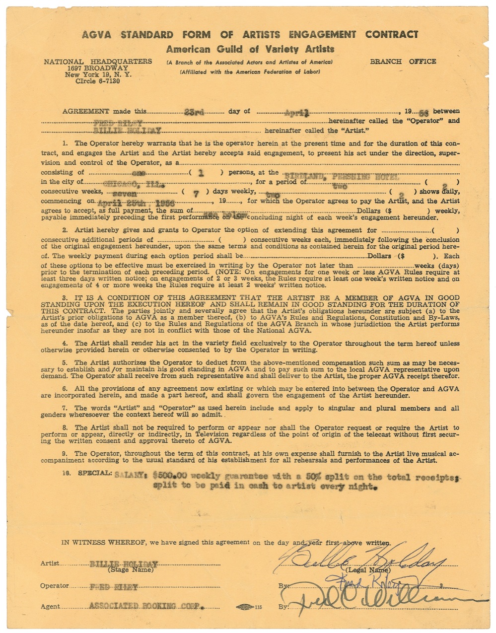 DS, one page, 8.5 x 10.75, January 23, 1953. Presented here is an AGVA Standard Form of Artists Engagement Contract by which Billie Holiday agrees to perform two shows daily for two weeks at the Birdland lounge in Chicago. As enthusiasts of her unique jazz stylings are surely aware, the legendary singer frequented New York city’s own Birdland jazz club. In fact, Holiday was even able to perform there after the club’s owner, her boyfriend, pulled strings to procure for her a cabaret card after hers was revoked following a drug conviction. The offered agreement made binding Holiday’s promise that she would showcase her singular talents for those lucky individuals that visited the Windy City’s iteration of the NYC locale. She signed the page, boldly in fact, in blue ballpoint, and the document was also penned by the club’s operator and a booking agent. In fine condition with a few small edge chips, light creasing and wrinkling. RRAuction COA.