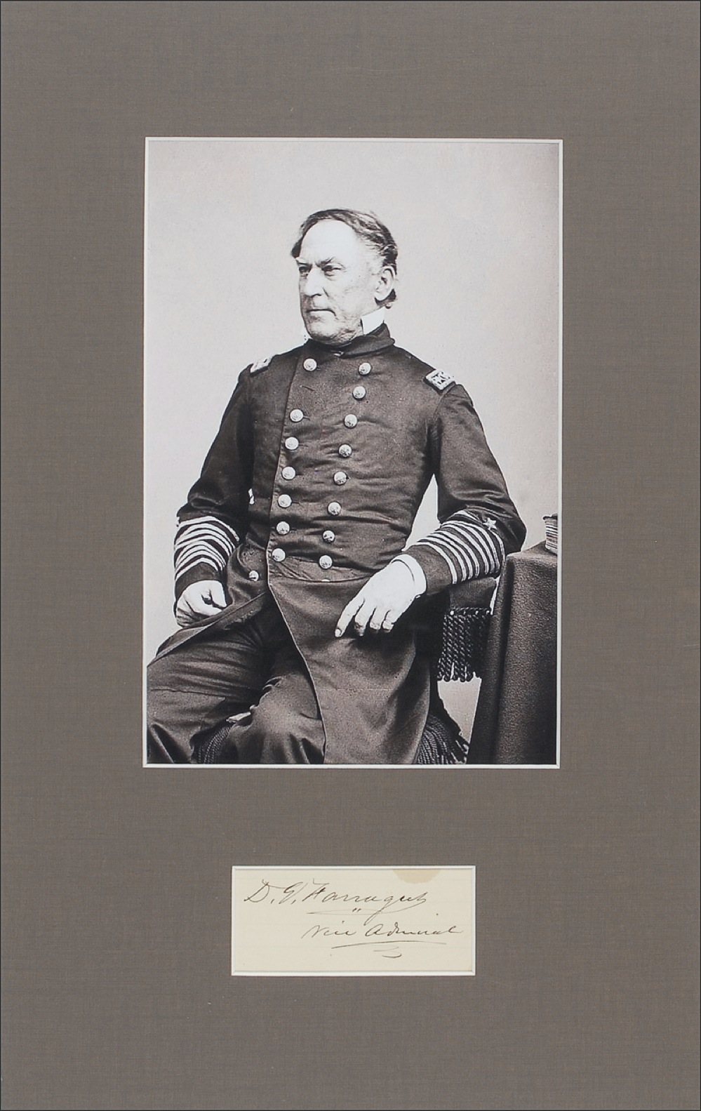 Ink signature, “D. G. Farragut, Vice Admiral,” on an off-white lightly-lined slip. Matted with a seated portrait of Farragut, to an overall size of 10 x 16. In very good condition, with some light creasing and wrinkling, and a small spot of toning above signature. RRAuction COA.
