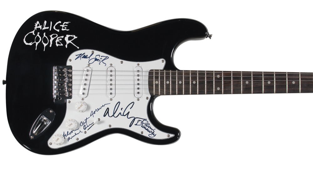 Black-bodied New York Pro ‘stratocaster-style’ electric guitar, with Cooper’s name on the body, signed in black felt tip on the white pickguard by all four surviving members of the original band, including Alice Cooper, Dennis Dunaway, Neal Smith, and Michael Bruce, adding "School's Out Forever." In fine condition. Oversized. RRAuction COA.