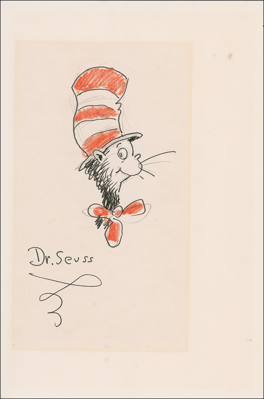 Original signed ink and pencil sketch of the Cat in the Hat on an off-white 6 x 9 card, signed in the lower left, “Dr. Seuss.” In fine condition, with light overall toning from previous display. RRAuction COA.