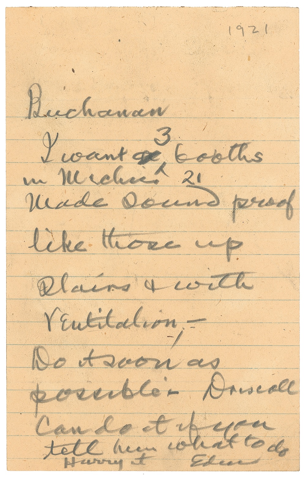 ANS signed “Edison,” one page, lightly-lined, 5 x 8, 1921. Edison writes to [Jaffrey P.] Buchanan, manager of his record disc division. In full: “I want 3 booths in machines 21 made sound proof like those up plains & with ventilation - Do it as soon as possible. Driscoll can do it if you were to tell him what to do. Hurry it.” Light overall toning, and scattered light soiling, otherwise fine condition. RRAuction COA.