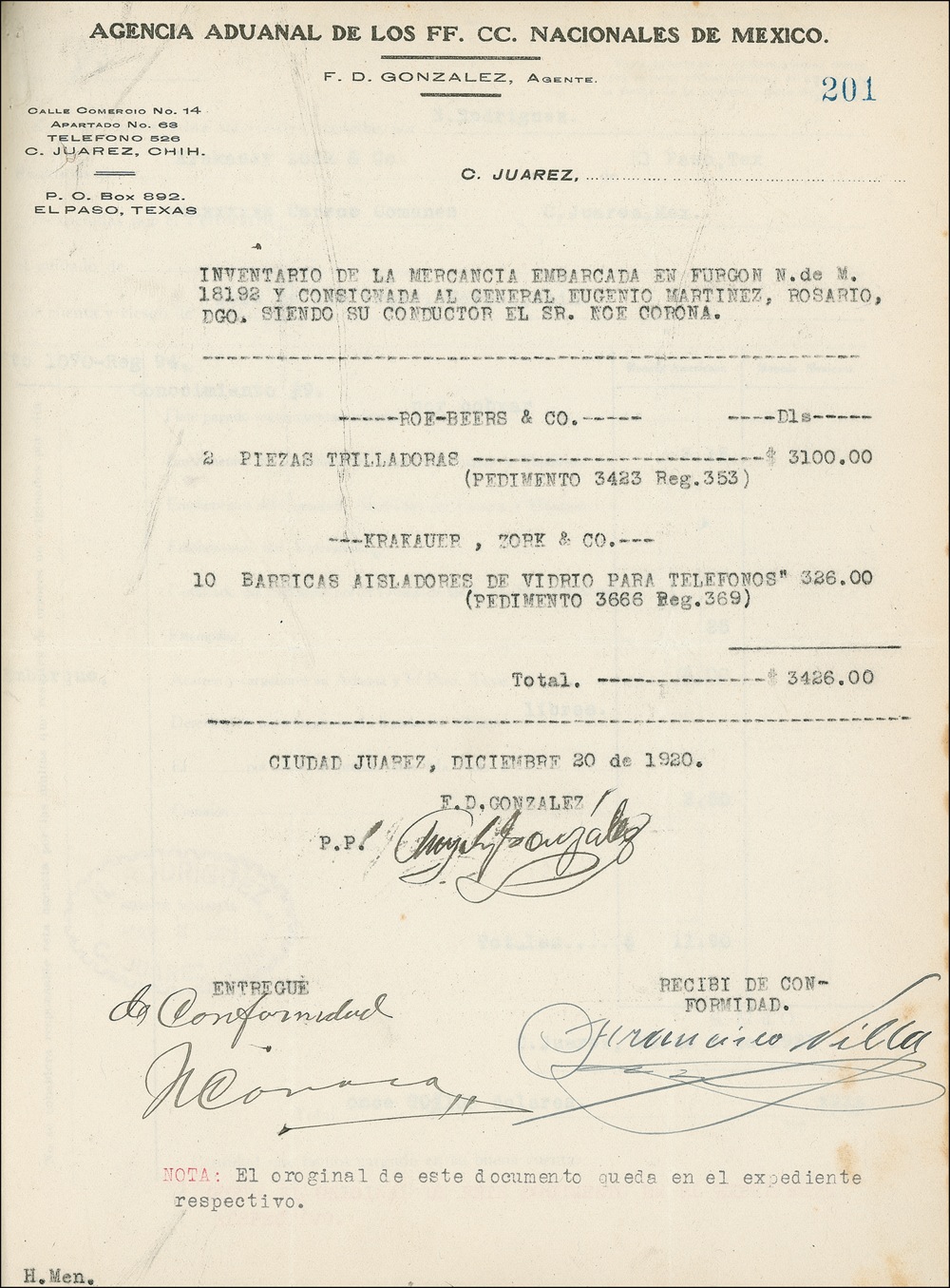 Huge collection of original telegrams affixed to pages, copied texts of telegrams, and three documents, all in Spanish, including two signed by Pancho Villa, 203 numbered pages, 8.25” x 10.5”, bound in quarter-leather binding with textured burgundy boards, four raised bands with gilt titles on calf leather spine “Implementos de Agricultura Villa” and “1920-1921.” Title page reads: “Copy of the dossier relative to the purchase of implements of agriculture for Mr. Francisco Villa, by the Mexican Government, by way of the General Consulate of Mexico in El Paso, Tex. 1920-1921.” The telegrams, many to and from Luis Montes de Oca, are dated from August 28, 1920 to May 19, 1921. After serving as Consul General of Mexico in El Paso, Luis Montes de Oca served as Mexico’s Minister of Finance (1927-1932) and as Director of the Bank of Mexico (1935-1940). Bookplate of Mexican engineer Jose Ambrosi Carraro affixed inside front cover. On May 20, 1920, Mexican Pres. Venustiano Carranza was assassinated and Adolfo de la Huerta became the interim president of Mexico. On July 28th, Villa and de la Huerta signed an agreement by which Villa accepted amnesty and became a private citizen in return for a large acre ranch in Canutillo, Durango, across the border from Chihuahua, as well as a pension and, as evidenced by this collection, supplies. Huerta was succeeded by Álvaro Obregón in December. Pancho Villa was assassinated in 1923 by “obregonistas,” fearful that he was planning to come out of retirement and oppose Pres. Obregón . The telegrams include those sent and received by Montes de Oca. Recipients and senders include Pancho Villa, Presidents De la Huerta and Obregón, General-in-Chief Eugenio Martinez, and supply companies. Archive includes: (1)DS, signed “Francisco Villa” and “L Montes de Oca” as Consul General de Mexico, one page, 8 x 10.5. A carbon signed in ink, with the seal of the Consul General of Mexico in El Paso, Texas, stamped in the blank left margin. Consulado General de Mexico, El Paso, Texas, February 28, 1921. Headed “Inventory of Items sent to Mr. Francisco Villa, in October 1920 and January 1921.” Signed under “Given” by Montes de Oca and “Received” by Villa. Listed with cost in dollars are: “2 Boxes with four Telephones…90.00 - 10 Tents 10 Bundles with Poles for Tents…200.00 – 1 cask Bracket.6.75 – January 5--1921 56 Rolls of wire prong…473.20 Total Dls 769.95.” Numbered page “167” in upper right. (2)DS signed “Francisco Villa,” “per agreement/N. Corona,” and “Frey D. Gonzalez,” one page, 8 x 10.5.A carbon signed in ink, on letterhead of the “Customs Agency of the National Railroads of Mexico, F.D. Gonzalez, Agent.” Ciudad Juarez, Chihuahua, Mexico, December 20, 1920. Headed “Inventory of the Merchandise Loaded on Boxcar No. 18192 and Delivered to Gen. Eugenio Martinez, Rosario, Durango, Whose Conductor is Mr. Noe Corona.” Signed by Corona under “Given” and by Villa under “Received as Agreed.” Delivered to Villa from Roe, Beers & Co., with the cost in dollars, are “2 Pieces Threshing Machine…$3100.00 (Order 3423 Reg. 353), from Krakauer, Zork & Co., “10 Insulated Glass Casks for Telephones…$326.00 (Order 3666 Reg. 369).” Total $3426.00. Numbered page “201” in upper right. There is also a related December 9, 1920 document, numbered page “194,” signed by Gonzalez and Corona. In fine condition, with mild overall toning to pages, as well as some scattered light toning and foxing. Pre-certified John Reznikoff/PSA/DNA and RRAuction COA.