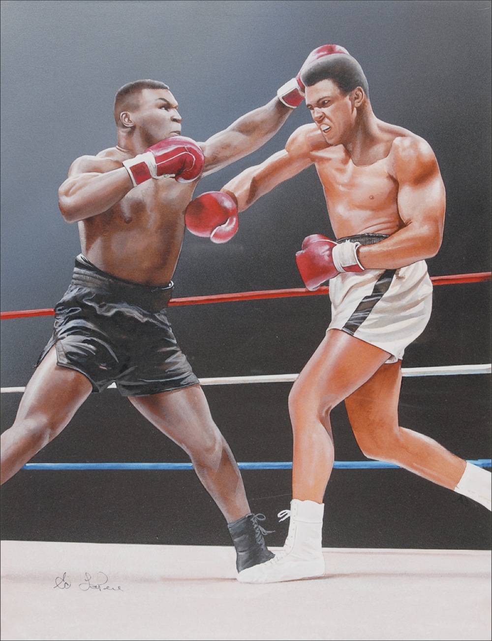Original oil painting on a 12 x 15.5 piece of artist’s illustration board, depicting Muhammad Ali battling Mike Tyson in the ring, signed in the lower left corner in black felt tip by LaPere. In very fine condition. RRAuction COA.