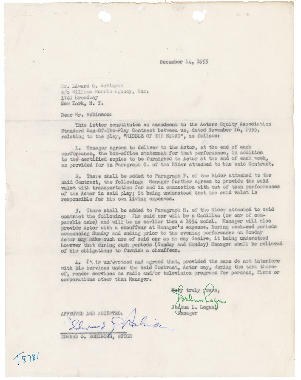 DS, one onionskin page, 8.5 x 11, December 14, 1955. Amendment to an agreement between Robinson and Logan in regards to the play Middle of the Night. Logan promises to deliver the box office receipts to Robinson at the end of each performance as well as providing a chauffeur-driven Cadillac “no earlier than a 1954 model.” Signed at the bottom in blue ink by Robinson and in green ink by Logan. In fine condition, with punch and staple holes to top, small notation to bottom, and expected folds. Pre-certified PSA/DNA and RRAuction COA.