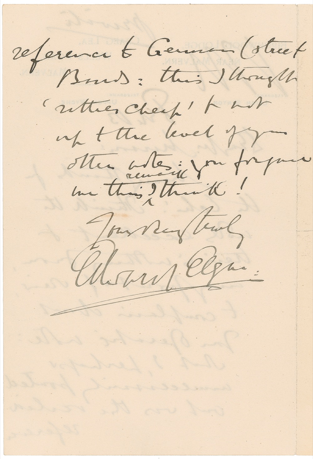 Leading English composer of his generation and a significant figure among late Romantic European musician. ALS, one page, both sides, 4.5 x 7, February 13, no year. In full, “Many thanks for the Echo I think the note’s excellent and there’s nothing from any point of view to complain about. Your operatic note: what I perhaps unnecessarily pointed out was the veiled reference to German street bands: this I thought ‘rather cheap’ and not up to the level of your other notes you forgave me this remark I think!” Small stain to first page and ink slightly showing through from opposing sides, otherwise fine condition. RRAuction COA.