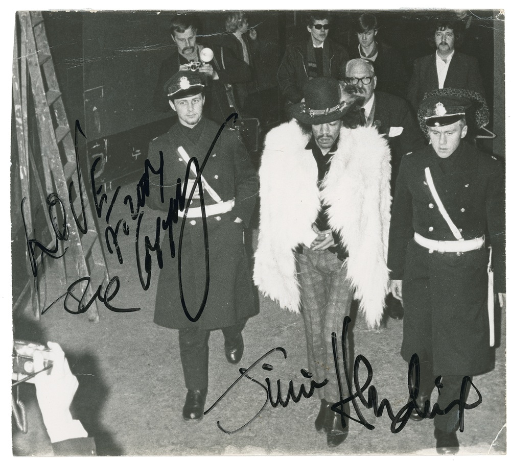 Vintage glossy 8 x 7.25 candid photo of a fur-clad Hendrix with a European police escort amid a throng of photographers and fans, signed in black felt tip, “Jimi Hendrix,” and also signed “Love from Gerry” [Gerry Stickells, Hendrix’s road manager]. The reverse bears the date January 29, 1967 and the notation “En Hålsning från Agneta” [evidently alluding to the original recipient]. On the same date, Hendrix opened for The Who during a famous performance at the Saville Theatre in London. In very good condition, with trimmed edges, moderate all over creasing, and small tape remnants to reverse. A desirable prize from this most celebrated of music legends! Pre-certified Roger Epperson/REAL and RRAuction COA.