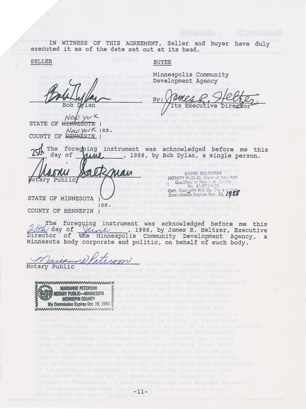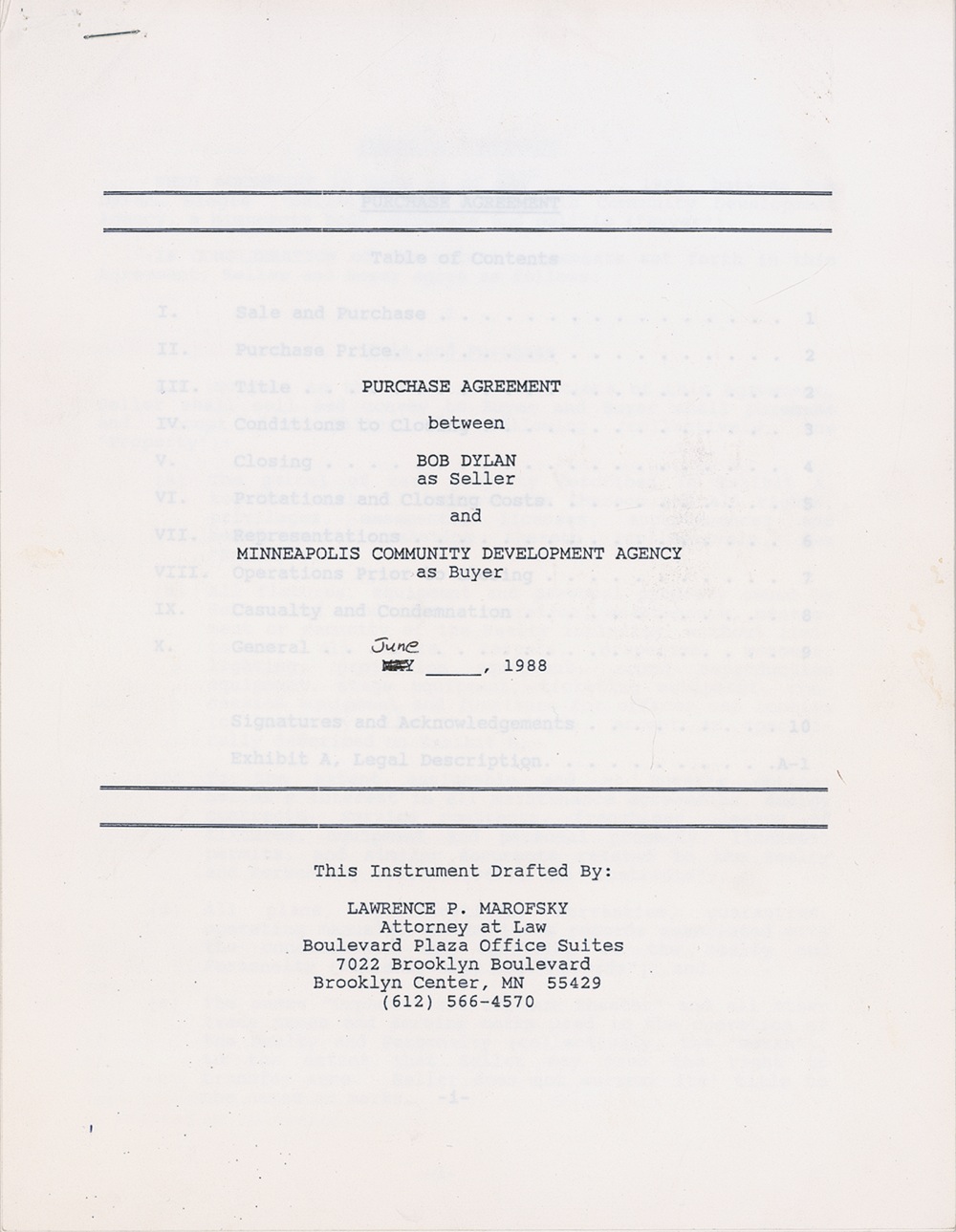 DS, twelve pages, 8.5 x 11, June 1988. Purchase agreement between Dylan (as seller) and the Minneapolis Community Development Agency (as buyer) arranging for the latter to purchase the Orpheum Theatre in Minneapolis, for a total price of $1.4 million in cash. The Agency purchased the theater from Dylan and his brother and restored and reopened it in 1993. 1988 would prove to be a very busy and successful year for Dylan musically as well, with his induction into the Rock and Roll Hall of Fame, the start of his Never Ending Tour, and the formation of the Travelling Wilburys as well. Signed on the last page in black felt tip by Dylan. In fine condition. Pre-certified Roger Epperson/REAL and RRAuction COA.