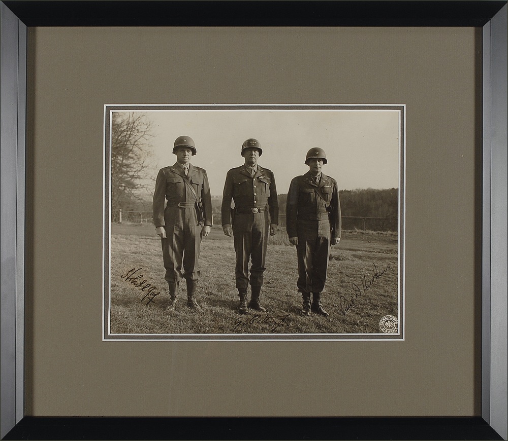Vintage matte-finish 9.5 x 7.5 U. S. Army Signal Corps photo of Patton standing at attention in the countryside (presumably in France) with two other one-star generals, Brigadier General Horbert R. Gay and Brigadier General Paul D. Harkins. Harkins served as Patton’s Deputy of Operations and Gay was Chief of Staff for Patton’s Third Army. Both Gay and Harkins joined Patton’s staff just in time for the famous rush to save Bastogne and the end of the Battle of the Bulge. Signed in fountain pen, “G. S. Patton, Jr.,” and also signed by Gay and Harkins. Archivally double matted and framed to an overall size of 17 x 14.5. On December 9, 1945, Patton and Gay were seated in the back seat of the staff car, en route to a hunting lodge. There was a traffic accident, during which Patton sustained spinal injuries which later cost his life. In fine condition, with a few scattered light surface marks, and light haloing to Gay’s signature. RRAuction COA.