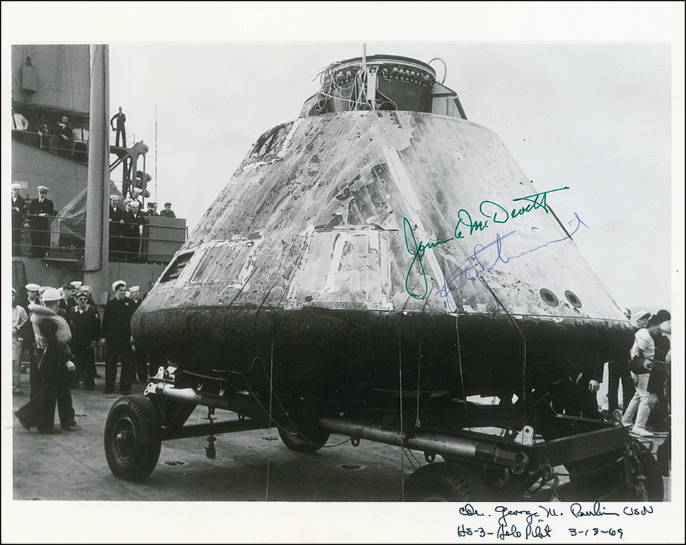 Satin-finish 10 x 8 photo of the capsule’s recovery signed in green felt tip by McDivitt, blue ballpoint by Schweickart, and in the lower border by the recovery helicopter pilot. A few small surface creases, otherwise fine condition. Pre-certified Scott Cornish and RRAuction COA.