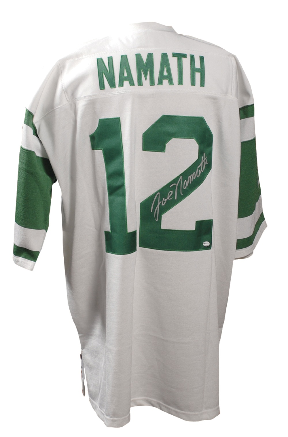 Official Mitchell & Ness replica New York Jets Super Bowl III throwback football jersey, with sewn-on letters and numbers, signed in black felt tip on the number on the back. In very fine condition. Pre-certified Steve Grad/PSA/DNA and RRAuction COA.