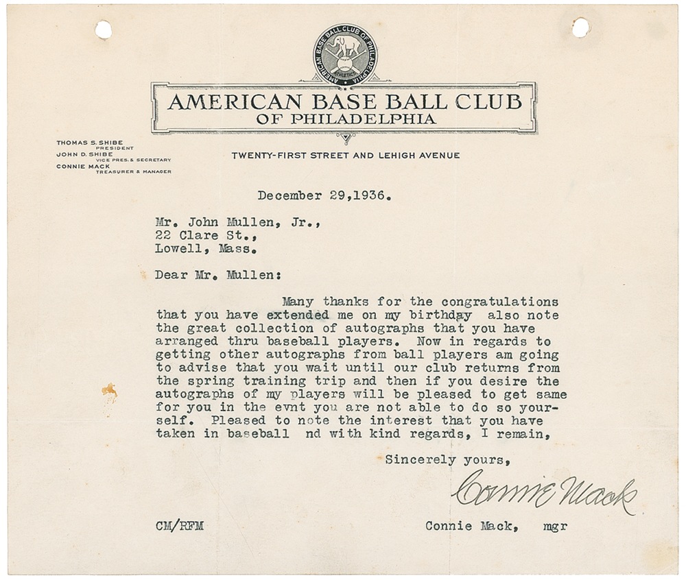 TLS, one page, 8.5 x 7, American Baseball Club of Philadelphia letterhead, December 29, 1936. In full: “Many thanks for the congratulations that you have extended me on my birthday, [I] also note the great collection of autographs that you have arranged thru baseball players. Now, in regards to getting other autographs from ball players, [I] am going to advise that you wait until our club returns from the spring training trip and then if you desire the autographs of my players [I] will be pleased to get same [sic] for you in the evnt [sic] you are not able to do so yourself. [I am] pleased to note the interest that you have taken in baseball nd [sic] with kind regards, I remain, sincerely yours.” Intersecting mailing folds, two punch holes at top edge, and a few spots of staining, otherwise fine condition. Pre-certified Steve Grad/PSA/DNA and RRAuction COA.
