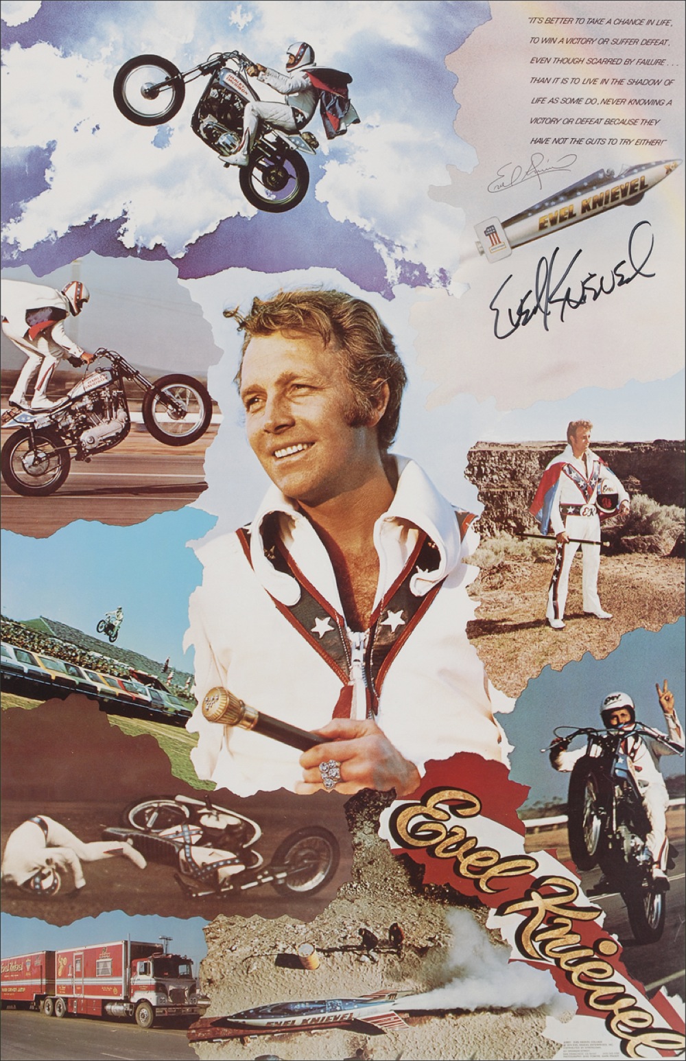 Color 16 x 25 composite poster of Knievel performing various feats of daring, signed in black felt tip, “Evel Knievel.” In very fine condition. RRAuction COA.