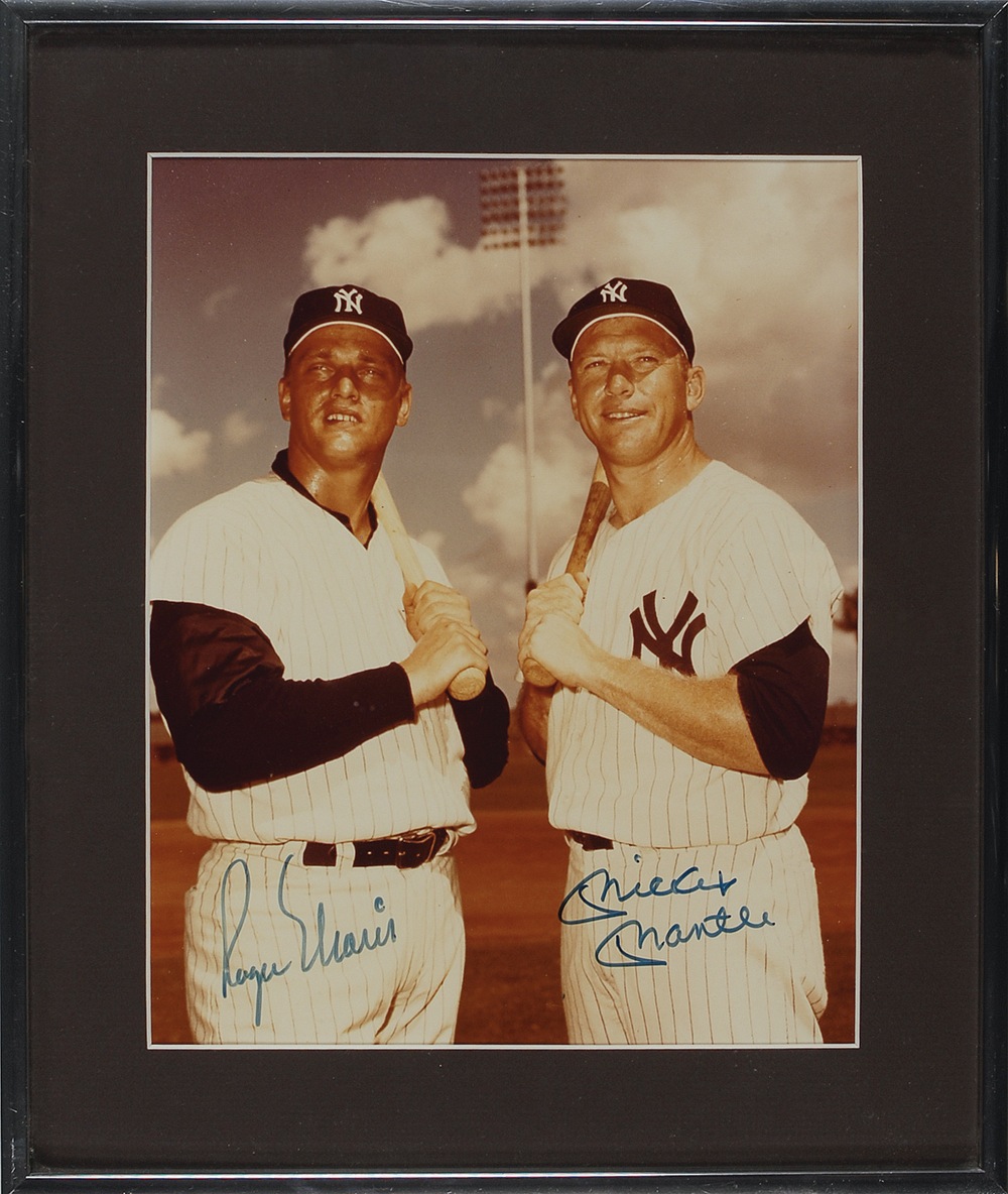 Color glossy 8 x 10 photo of the Yankees’ ‘M & M Boys’ posing together with their bats on their shoulders, signed in blue felt tip by both Mickey Mantle and Roger Maris. Matted and framed to an overall size of 11 x 13. Accompanied by a letter of authenticity from James Spence. In very fine condition. Pre-certified Steve Grad/PSA/DNA and RRAuction COA.