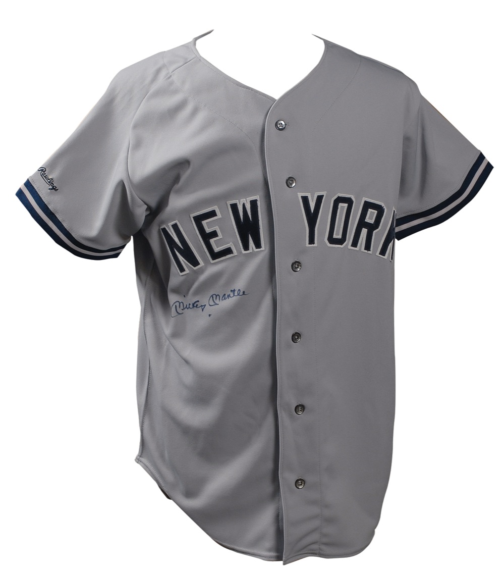 Official Rawlings replica New York Yankees road baseball jersey, with sewn on letters and numbers, signed in blue felt tip on the front. In very fine condition. Pre-certified Steve Grad/PSA/DNA and RRAuction COA.