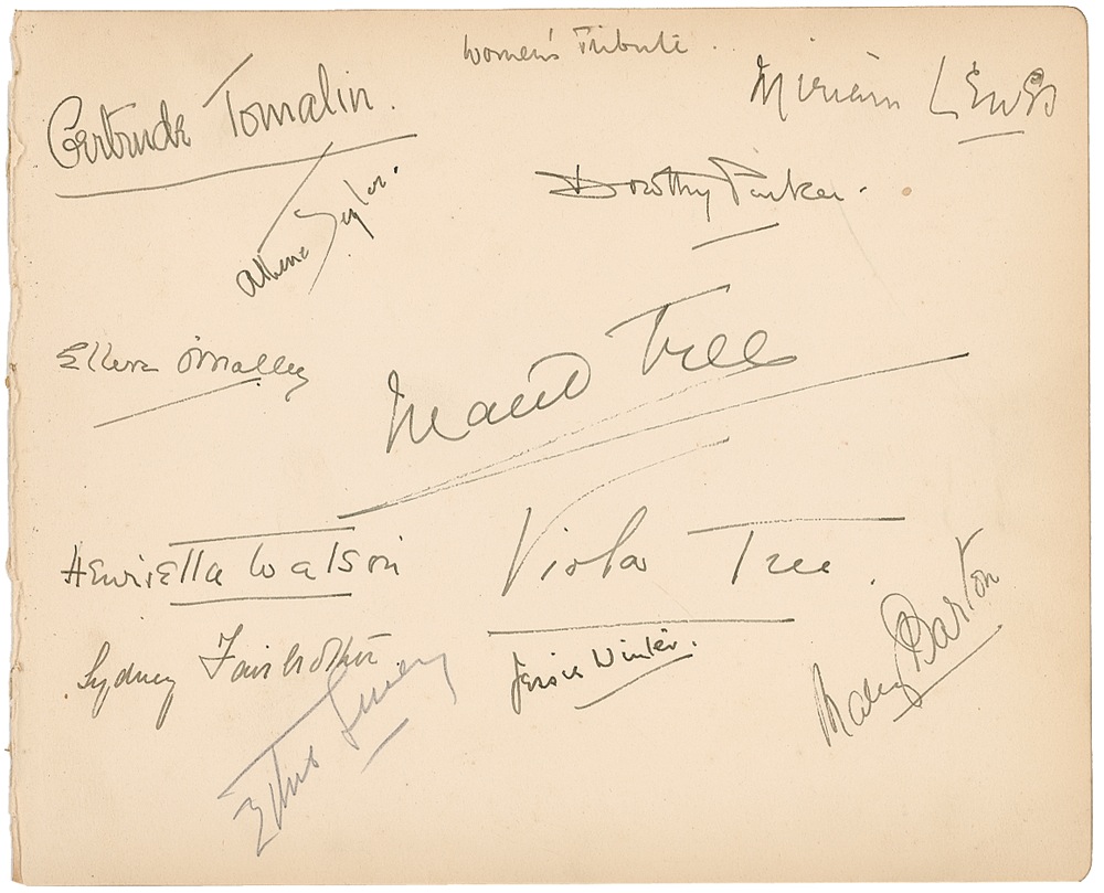 Writer and critic, best known for her often cruelly witty and cynical tone. Vintage fountain pen signature, “Dorothy Parker,” on an off-white 8.75 x 7.25 album page, notated at the top “Women’s Tribute,” signed on a visit to Great Britain. Page is also signed by Miriam Lewis, Athene Seyler, Maud Tree, Viola Tree, Henrietta Watson, Mary Barton, and Jessie Winter, as well as several others. In fine condition, with rough left edge, and a few scattered light creases. RRAuction COA.