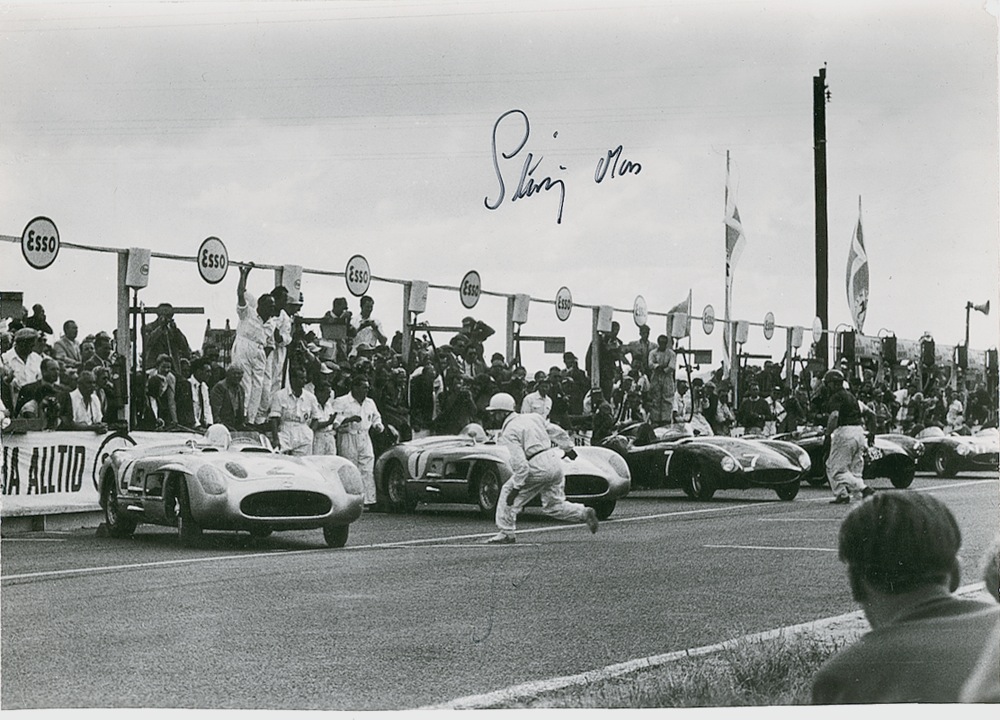 Glossy 8.5 x 6 photo of the race cars lined up at the starting line and the drivers running towards them for a flying start in the 1955 Grand Prix in Sweden, signed in black felt tip by Stirling Moss. In fine condition, with scattered light creases and a faint ‘S’ from an unsuccessful first attempt at signing. Pre-certified Steve Grad/PSA/DNA and RRAuction COA.
