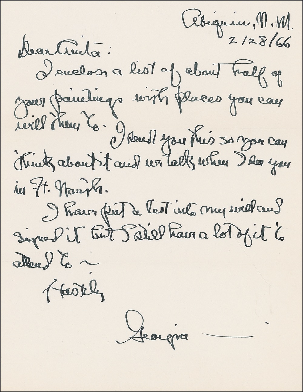 ALS signed “Georgia,” one page, 8.5 x 11, February 28, 1966. Letter addressed to Anita, most likely her longtime friend Anita Pollitzer. In full: “I enclose a list of about half of your paintings with places you can will them to. I send you this so you can think about it and we talk when I see you…I have put a list into my will and signed it but I still have a lot to attend to.” Following O'Keeffe's death her family contested her will because codicils to it made in the 1980s had left all of her estate to Juan Hamilton, her closest confidante, companion, and business manager until her death. The case, which was settled out of court, became famous as case law in estate planning. In fine condition. RRAuction COA.