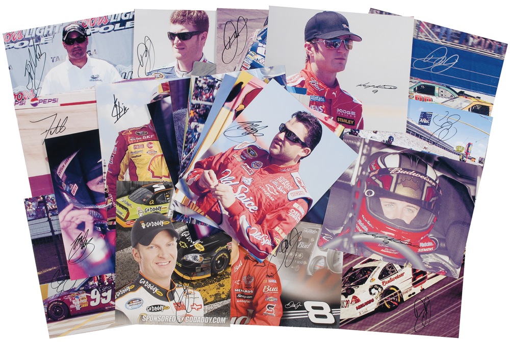 Fifty glossy and cardstcok 8 x 10 and 10 x 8 signed photos. Signers are: Tony Stewart (3), Jeff Gordon (4), Jimmie Johnson (4), Kasey Kahne (2), Bobby Labonte (2), Dale Earnhardt, Jr. (6), Juan Pablo Montoya (2), Casey Mears, Greg Biffle, Kyle Busch (3), Kurt Busch, Brian Vickers (2), Kevin Harvick (3), Car Edwards (3), Dario Franchitti, Matt Kenseth (3), Ryan Newman, Sam Hornish, Jr. (2), David Reutimann, Joey Logano (3), and Aric Almirola (2). In fine condition. Pre-certified Steve Grad/PSA/DNA and RRAuction COA.